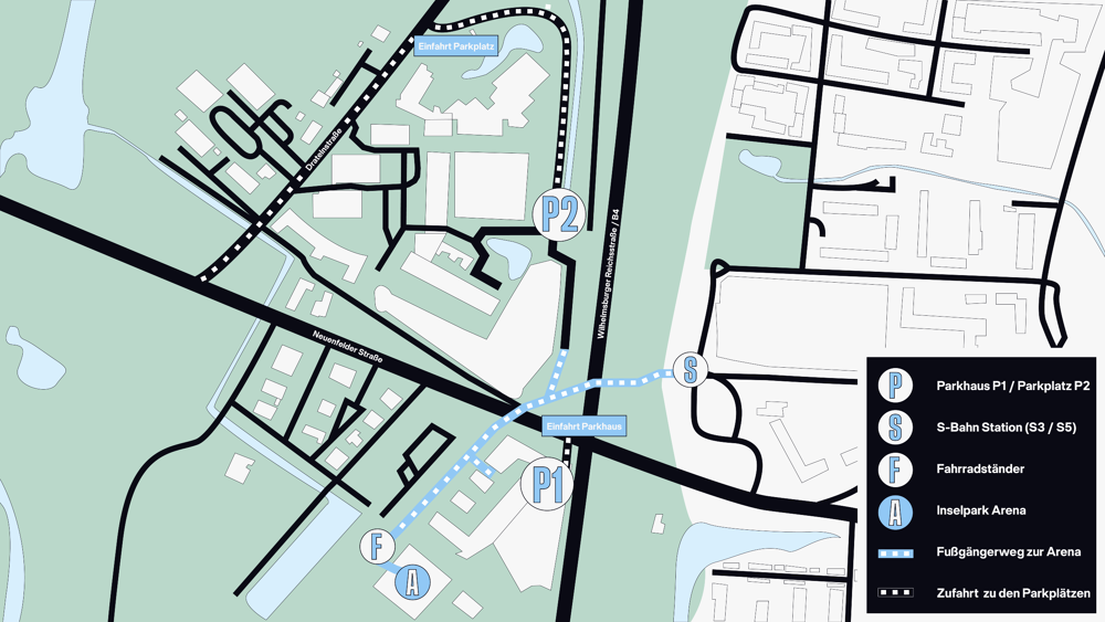 Die S-Bahn-Station „Wilhelmsburg“ liegt direkt am Haupteingang des Inselparks. Die Station ist mit Rolltreppen und einem Fahrstuhl ausgestattet und somit barrierefrei. Von hier aus sind es nur noch ca. 350 m Fußweg bis zur Halle. Durch das HVV-Kombiticket wird allen Towers-Fans mit einer Eintrittskarte freie Fahrt zu den Heimspielen ermöglicht.
